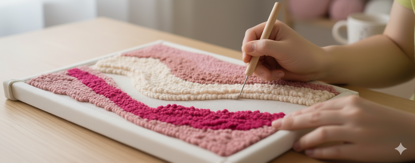 Punch needling is a relaxing embroidery technique that uses a special needle to “punch” loops of yarn through fabric, creating soft, textured designs. It’s beginner-friendly and incredibly therapeutic — perfect for a mindful craft night!